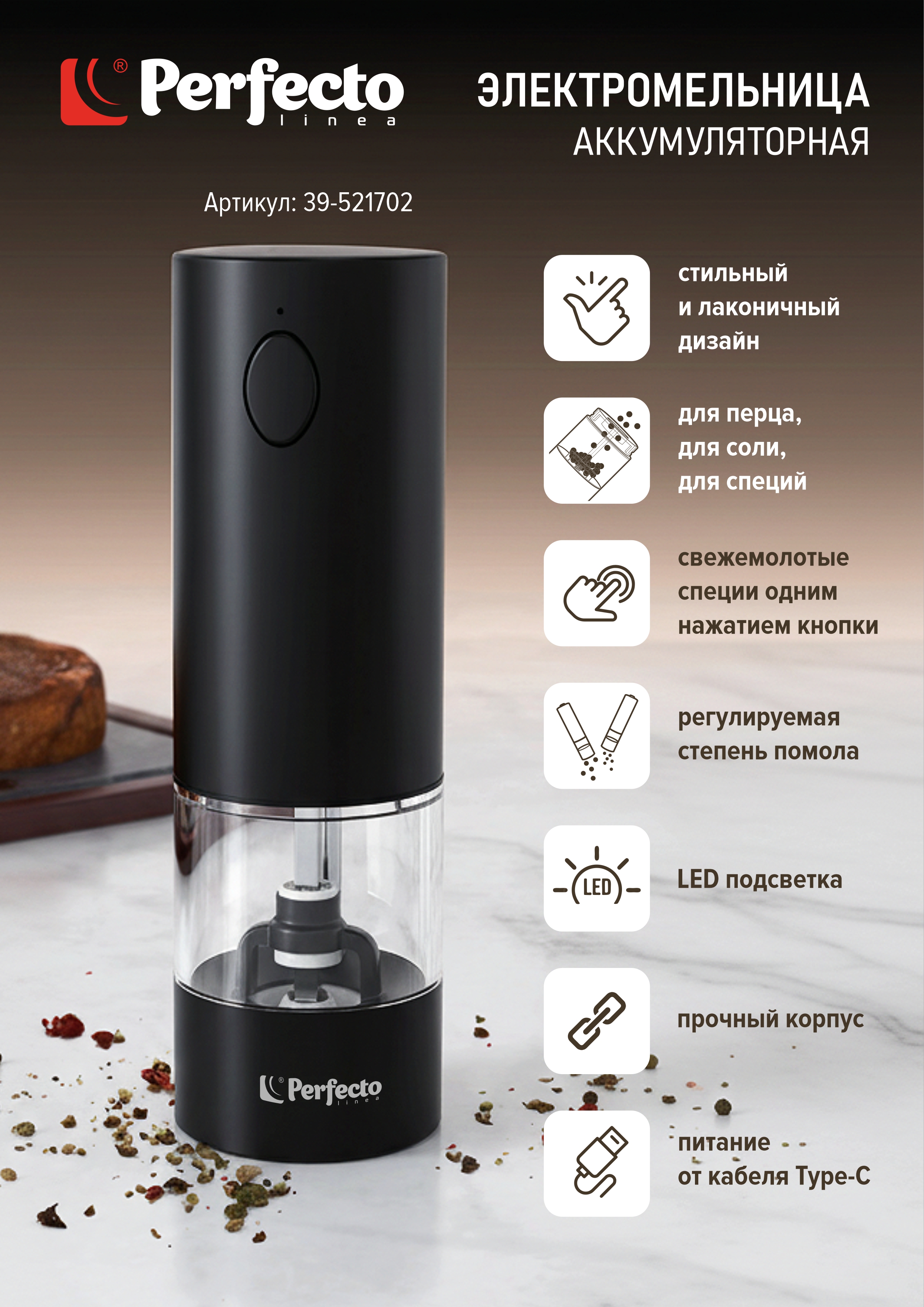 Электромельница, 5.2х17 см., черная, аккумуляторная, CHEF, PERFECTO LINEA