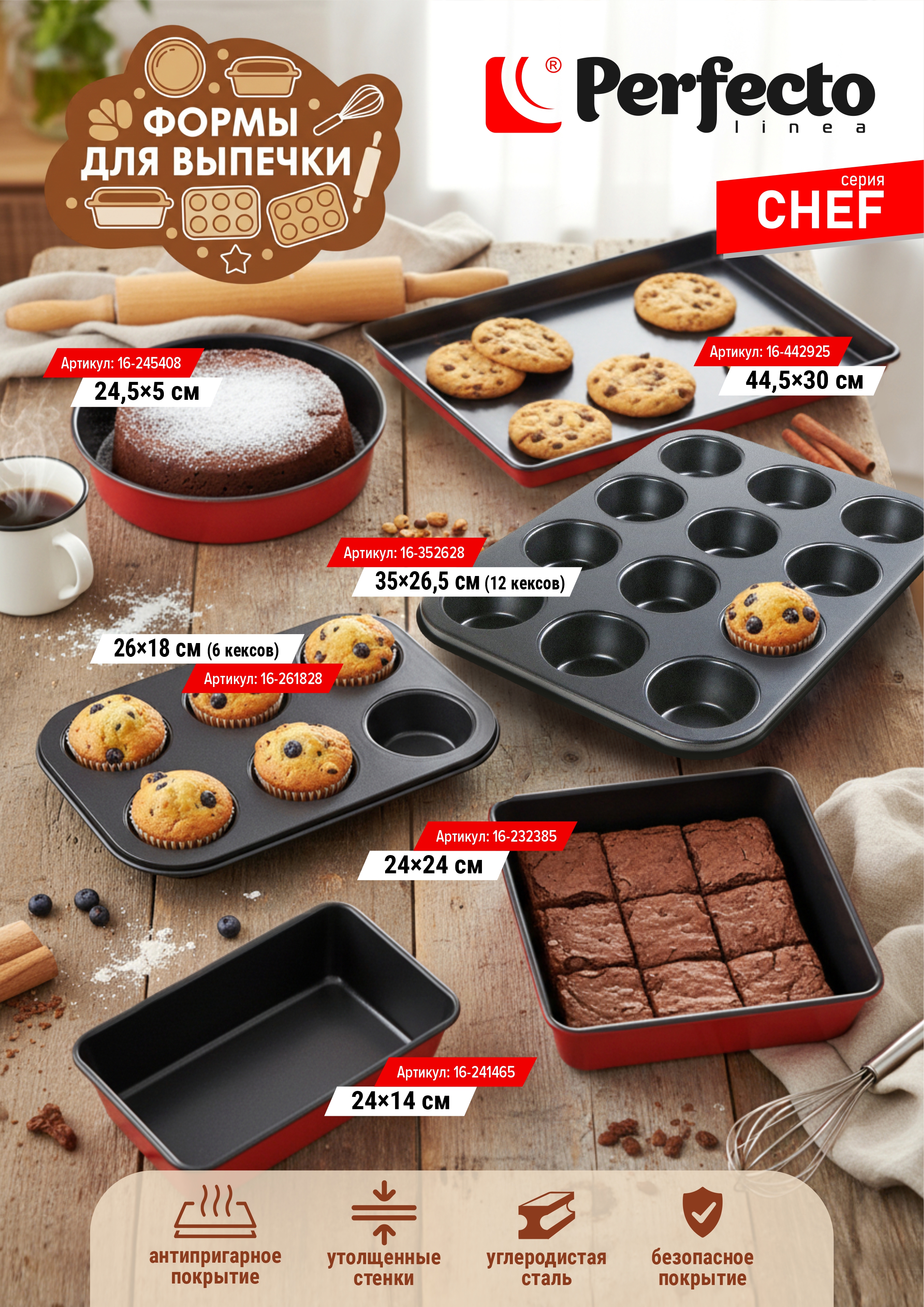 Формы для выпечки серии CHEF, ТМ PERFECTO LINEA предназначены для приготовления пищи в духовых шкафах. Формы выполнены из углеродистой стали высокого качества с внутренним антипригарным покрытием. Во время готовки пища не прилипает, не пригорает, что облегчает готовку. Формы рекомендуется использовать с силиконизированной бумагой для выпечки. Мыть формы рекомендуется мягкими губками для мытья, допускается использование посудомоечных машин. Не рекомендуется использование форм в кислотной среде, абразивных моющих средств, острых предметов, а так же хранение форм в ходольнике.