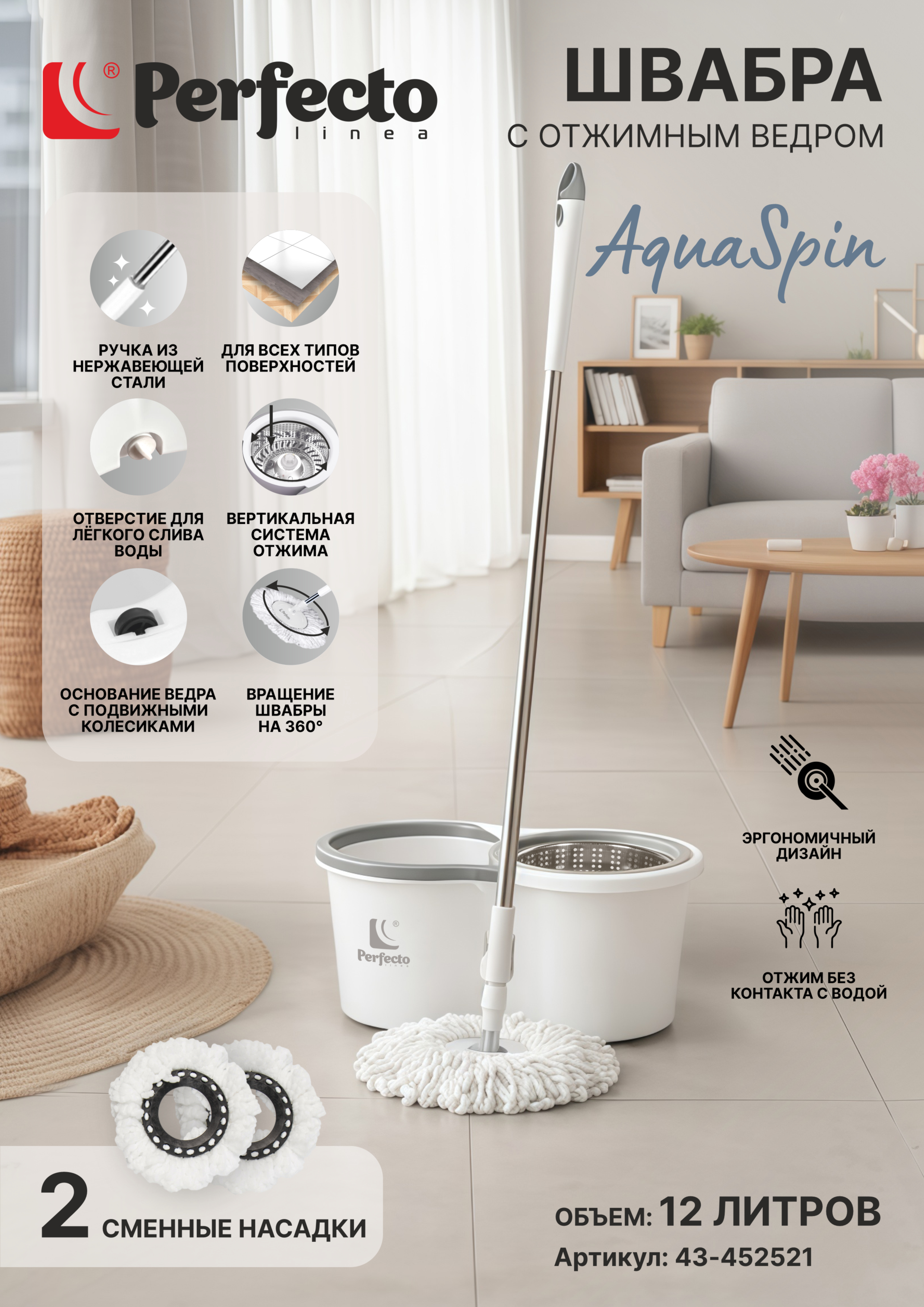 Швабра с отжимным ведром AquaSpin, бело-серая, PERFECTO LINEA (отжимное ведро, швабра, 2 сменных насадки из микрофибры.)