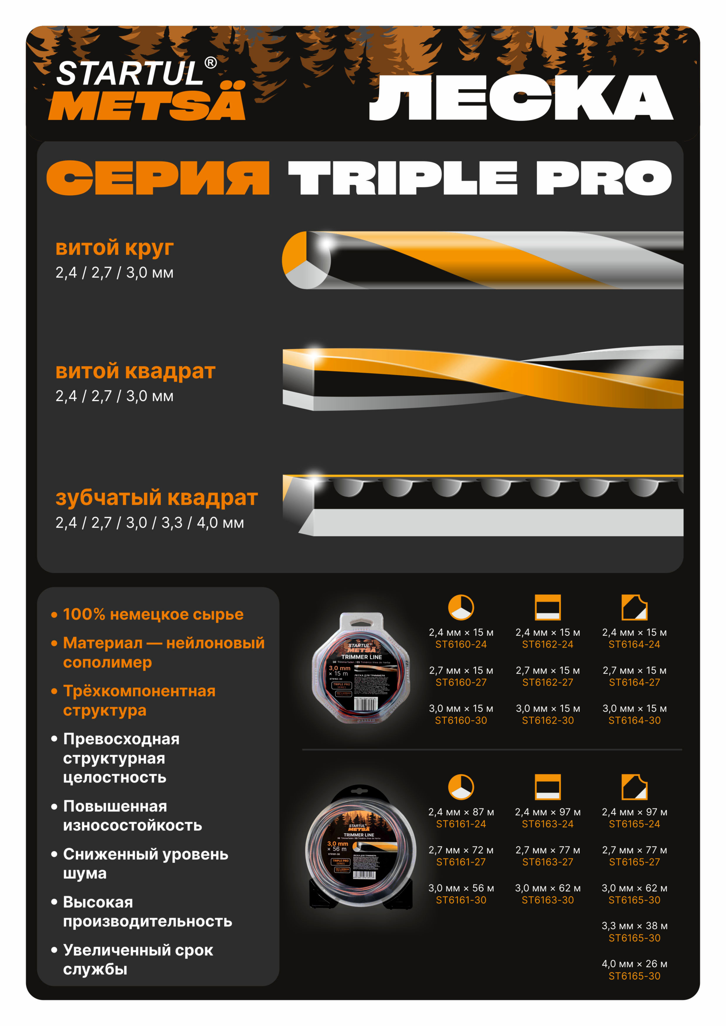 Леска ф 3.0 мм х 15 м зубчатый квадрат сеч. TRIPLE PRO STARTUL METSA (трехкомпонентная)