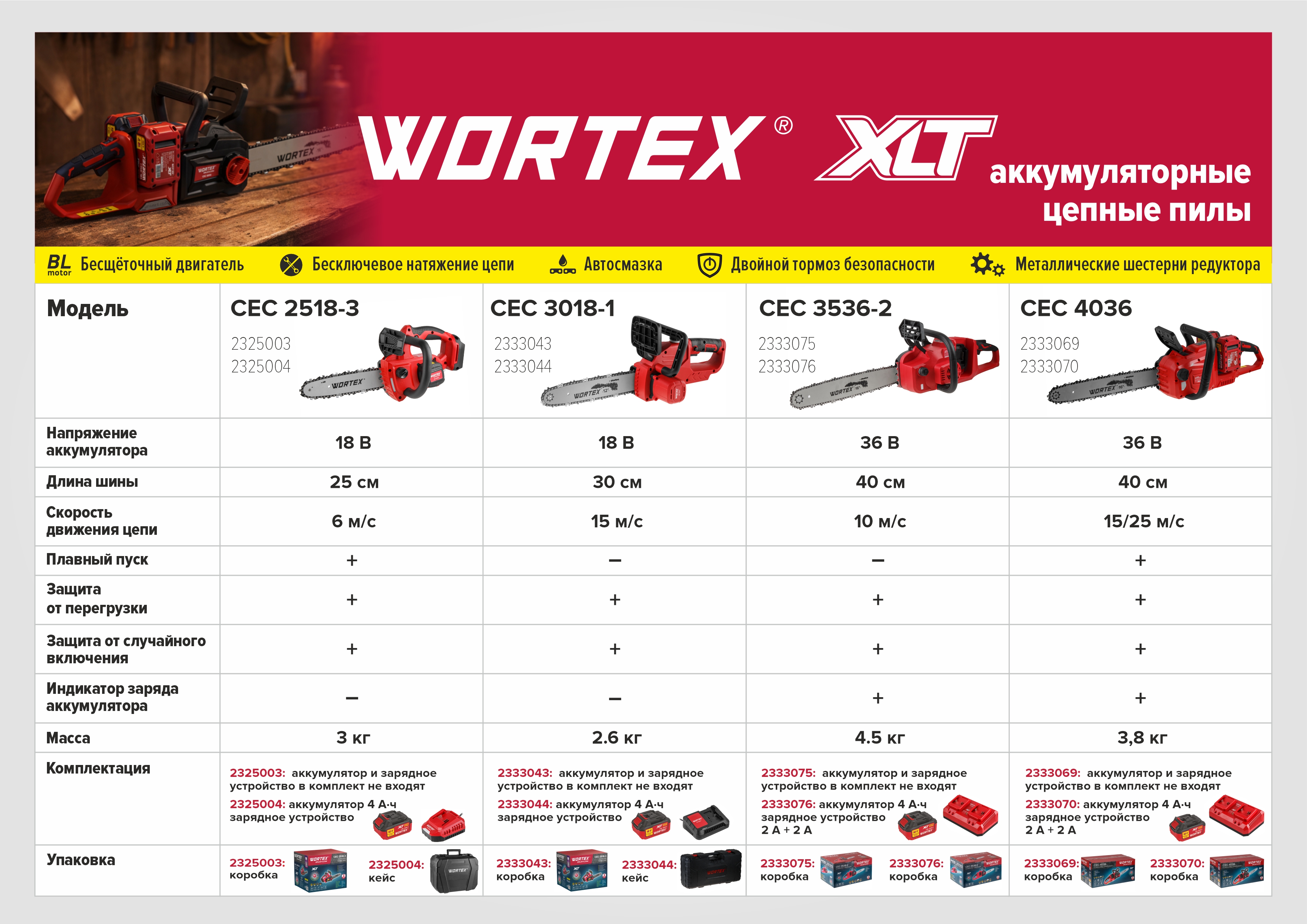 Аккум. пила цепная WORTEX CEC 3536-2 шина 40 см (16"), 3/8" LP, 1.3 мм ALL1 XLT SOLO БЕСЩЁТ, 18В+18В (БЕСЩЕТ.ДВИГ., БЕЗ АКБ И ЗУ, 36 В (18+18), шина 40 см, макс.скор.цепи 10 м/с)