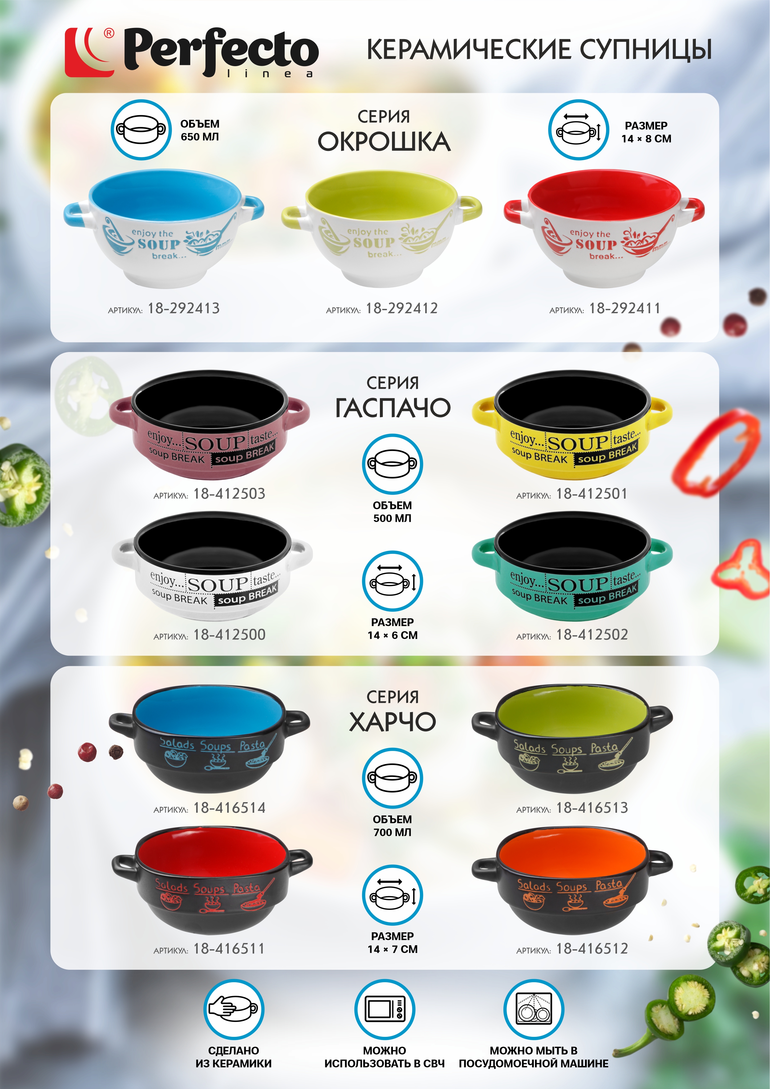 Супница керамическая, 140 мм, круглая, серия Окрошка, бело-красная, PERFECTO LINEA (объем 650 мл)